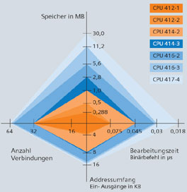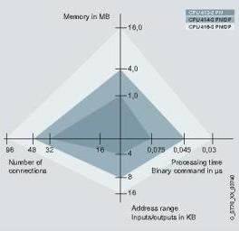 有一系列从入门级CPU直到高性能CPU,用于配置控制器。所有CPU控制大量结构;多个CPU可以在一个多值计算配置中一起工作以提高性能。由于CPU的高处理速度和确定性的响应时间,可缩短机器的循环周期。 不同的CPU具有不同性能,例如,工作存储器,地址范围,连接数量和执行时间。十款款标准的CPU,集成PROFIBUS、PROFINET 总线接口。说明